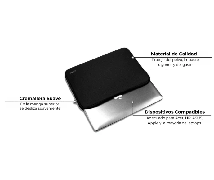 Una funda universal hecha en neopreno resistente que mantiene tu laptop segura contra golpes, rayones y salpicaduras mientras la transportas o la guardas en tu mochila o bolso.