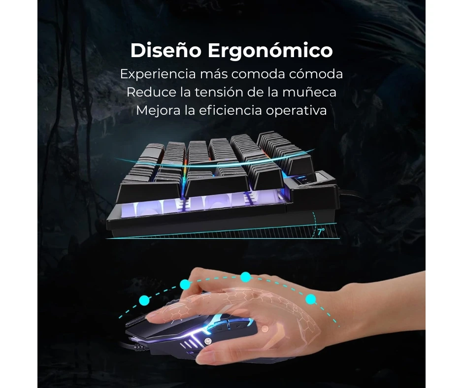 El mouse incluido está diseñado para ajustarse a tu mano con comodidad, permitiendo movimientos más suaves y precisos, sin tensión, ideal para largos periodos de juego o trabajo.